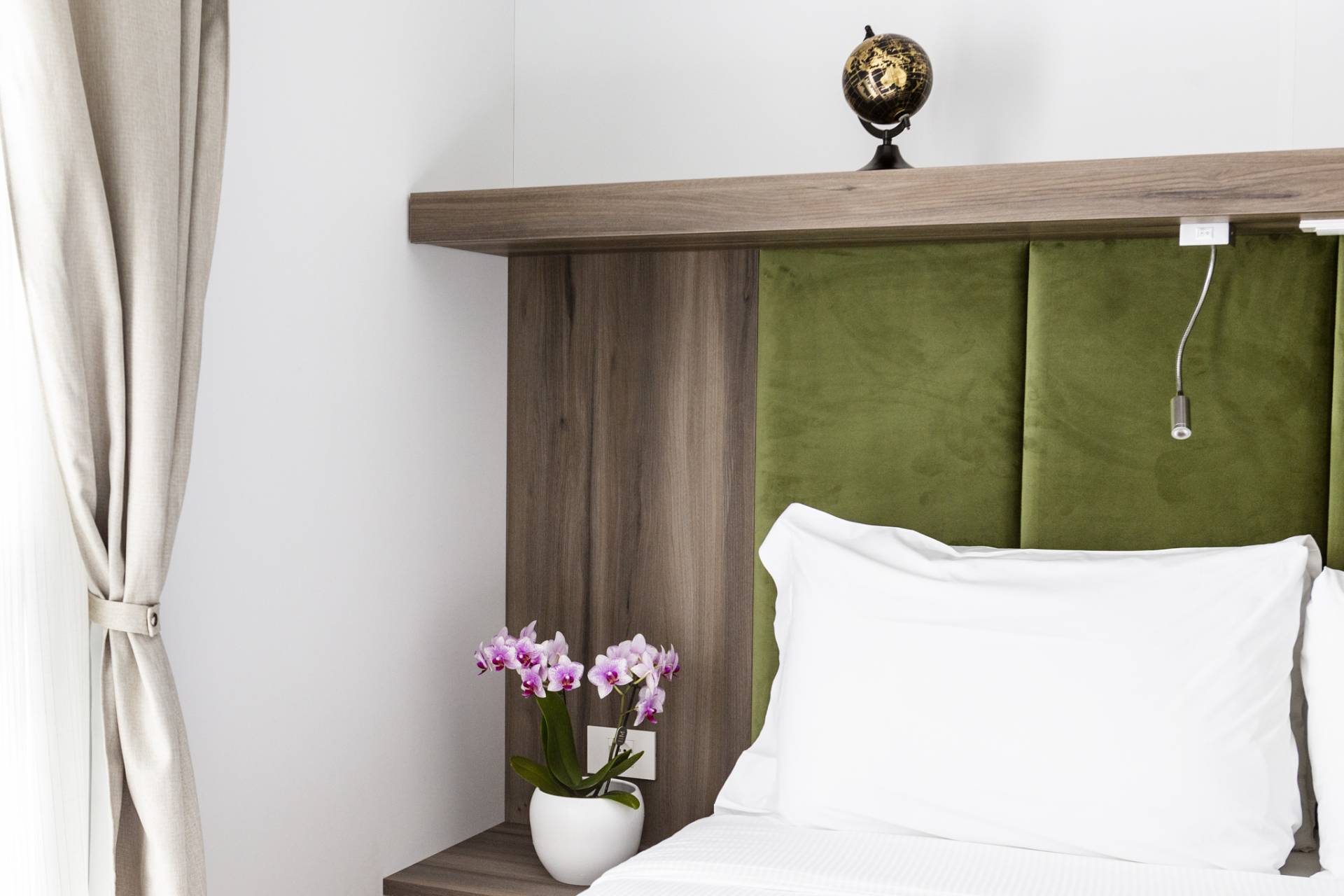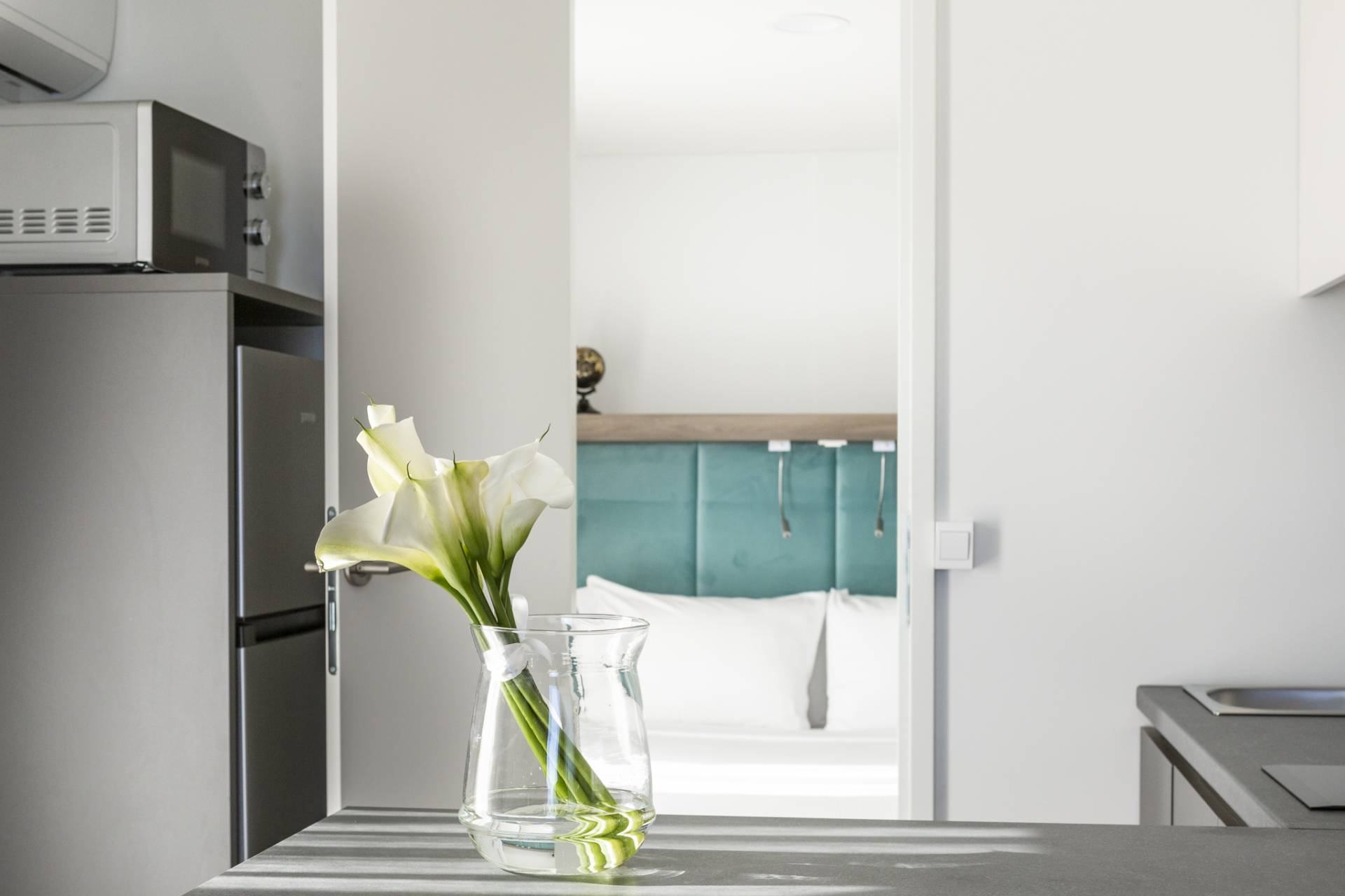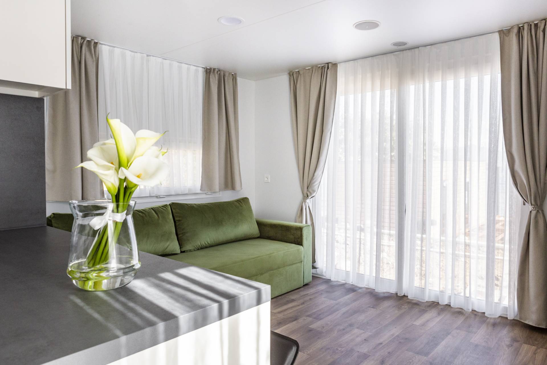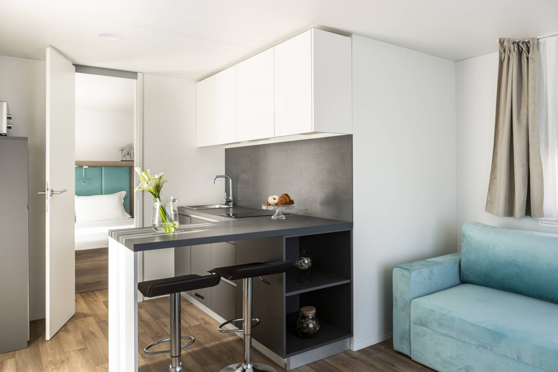 Desenzano Village project involved the installation of 8 Mline 754 H11 units: a perfectly crafted home for couples yet spacious and oversized. The houses' main themes are inspired by 2 natural elements, as the names provided by the client are evoking: Aqua and Terrae. The first one enhancing the ambiance with a refreshing pop of blue given by the squared-off sofa, and the second, boasting a botanical vibe, which carries an extra layer of allure to the overall aesthetic thanks to the velvety olive green canapé. The pops of color accentuate the anthracite and dark wooden furnishings, while shades of grey play a pivotal role, accentuating the charm of each room, finally, a harmonious yet airy combination that elevate the indoors with remarkable success.