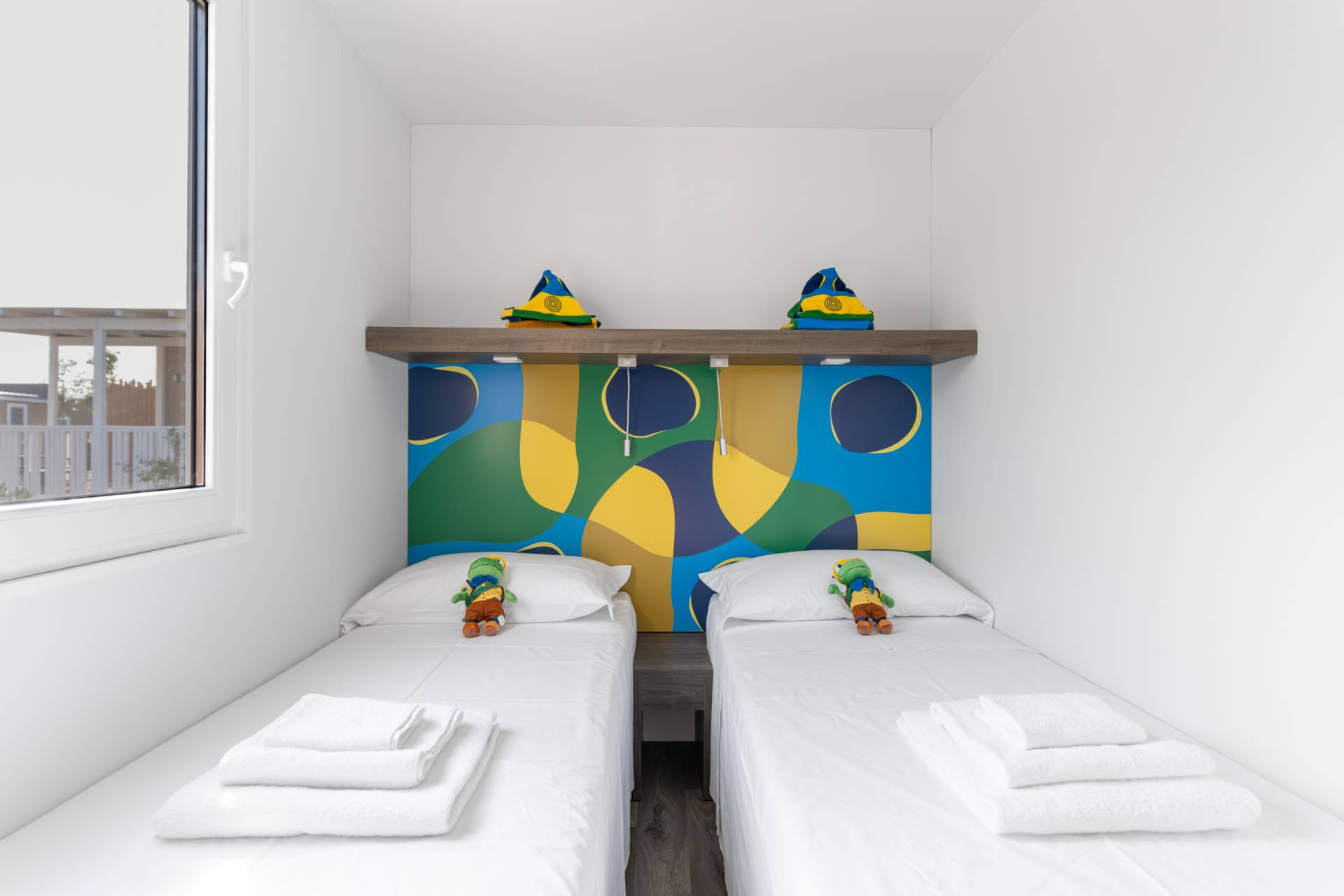 is adorned with playful motifs, as we presented in Desenzano del Garda and Jesolo. Two single beds and a wall decoration in vibrant hues reflective of the Group's logo adorn, fostering a creative and imaginative environment for young occupants. The bathroom boasts modern amenities and thoughtful design features aimed at maximizing comfort and convenience. Stepping out, the spacious L-shaped veranda offers a perfect alfresco chill area furnished with table and chairs and sunloungers . The main focus is certainly the outdoor slatted wood shower too: a solid enclosure ensuring extra privacy and smartly placed on the side of the terrace to rinse off postbeach or sport activity.